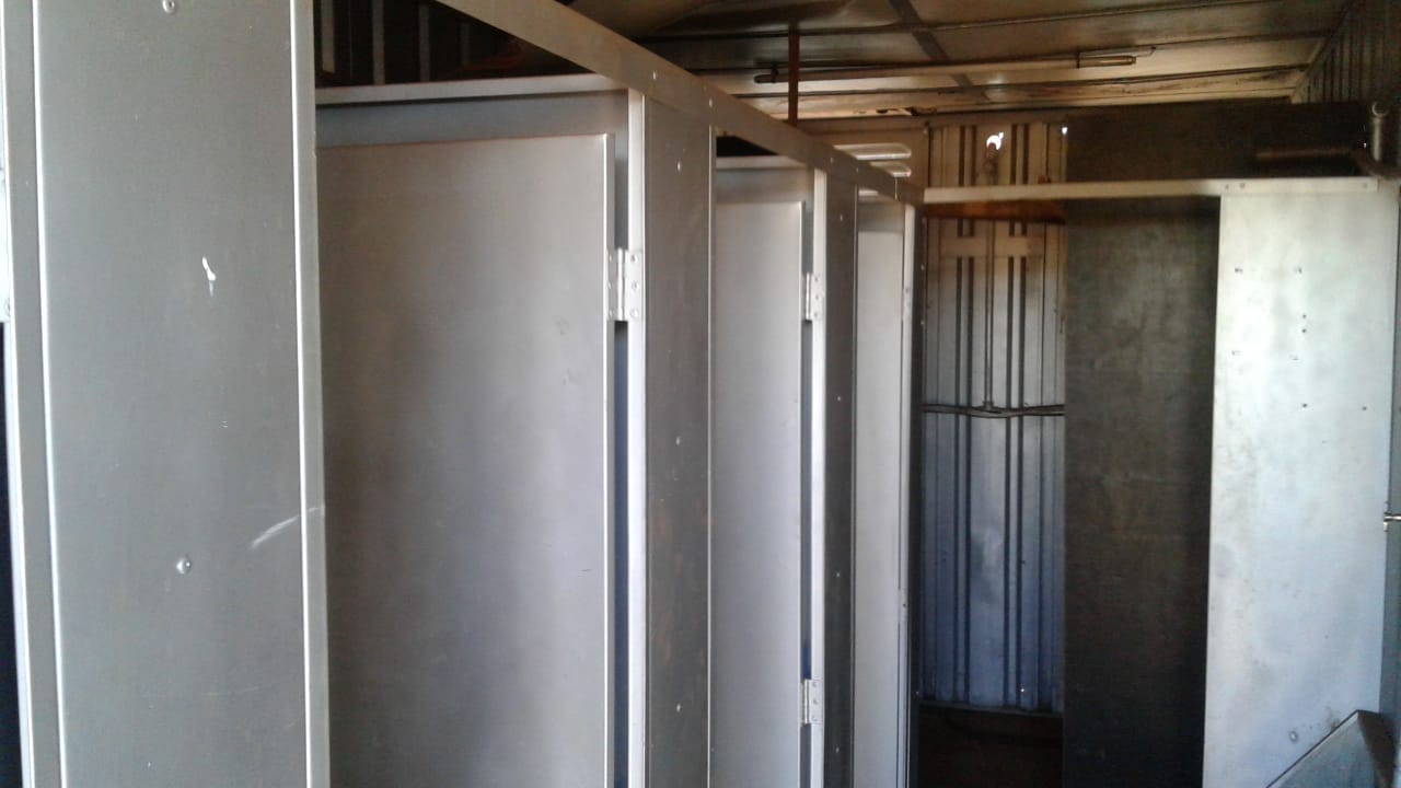 Revestimento com Forro e piso. Possui: 4 vasos, 8 chuveiros, 1 mictorio, 1 pia, 3 vassão de Ar, 3 portas.