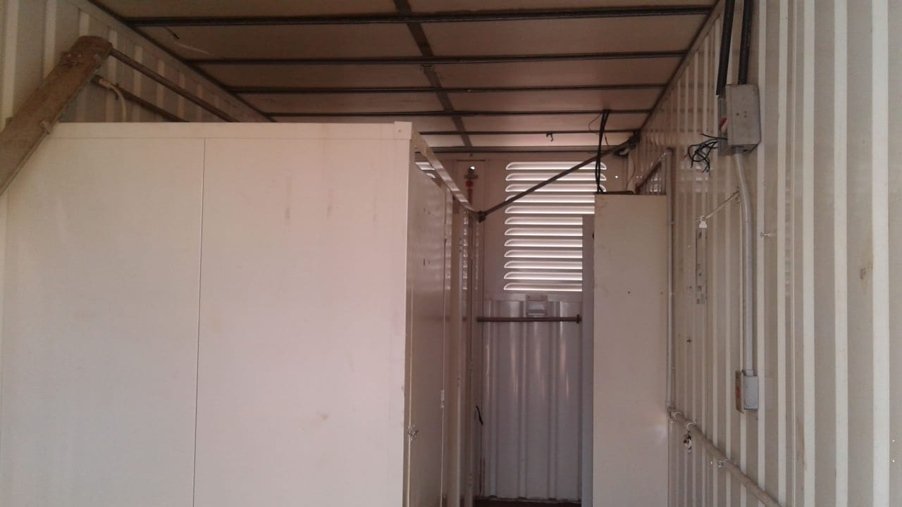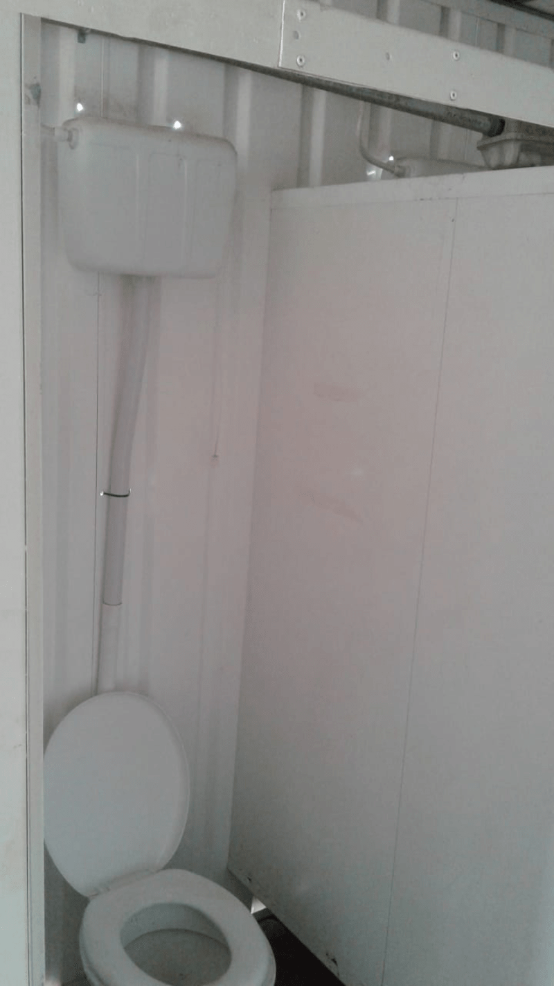 Revestimento com Forro e piso. Possui: 1 pia, 2 chuveiros, 3 vasos sendo 1 para deficientes, 1 porta, 3 vassão de ar