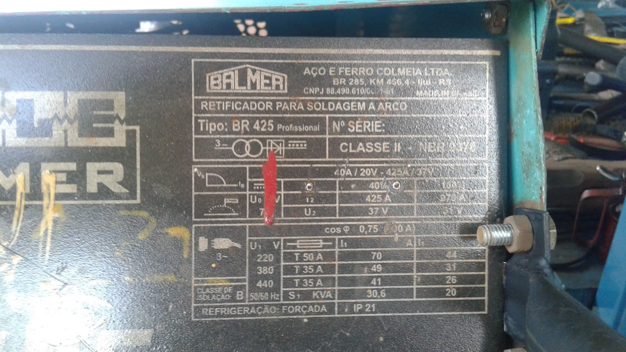 MÁQUINA RETIFICADORA DE SOLDA MARCA BALMER 425 AMPERES